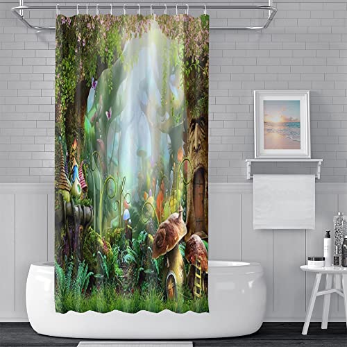 SDOTPMT 150x180cm Fairytale Mushroom Shower Curtain Magic Fantasy Forest Jungle Tree Bath Curtain Green Lawn Plant Leaf Floral Bathtub Curtain for Bathroom Decor Fabric Polyester with Hooks