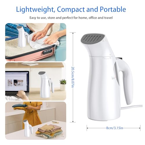 - [Ultimate Portability] The Travel Steamer for Clothes Weighs only 0.55 kg with an Ergonomic Handheld Design, This Mini Compact Hand Held Steamer Effortlessly Slips Into Handbags or Suitcases(Make Sure There is no Water in the Tank Before Loading). The included Travel Pouch Ensures Space-efficient Packing, while the 1.9-meter Power Cord Enables Flexible Positioning, Perfect for Last-times Touch-ups in Hotel Rooms or Conference Venues