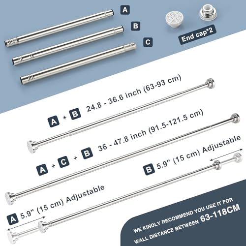 - ☑ Importance tips for using the curtain rod— Different connect way fits different wall length: When connecting two spring loaded rods, it can be adjusted from 22.8- 36.6“(63-93cm). When connecting two spring loaded rods and the middle rod, it adjusts from 36-47.8”(91.5-121.5cm). We kindly recommend you use it for wall distance between 63-118cm. Please carefully choose the connect way to different wall length.