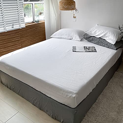 Simple&Opulence Super King Fitted Sheet, 100% Natural Linen Bed Sheet with 35cm Deep Pocket, Breathable Cozy Mattress Protector for Summer (White,180x200cm)
