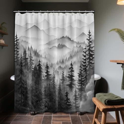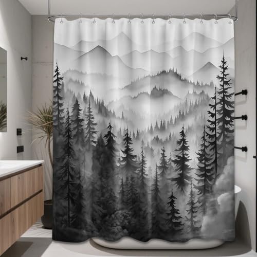Sonbraux Forest Shower Curtains for Bathroom Black White and Grey Nature Mountain Landscape Outdoor Garden Wet Room Shower Curtain, Washable, Waterproof, Cloth Fabric, 180 x 180cm