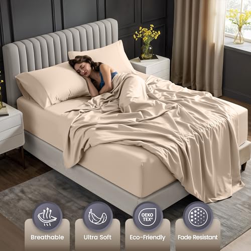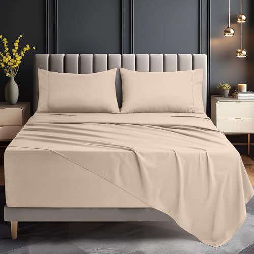 Utopia Bedding Queen Sheet Set – Soft Microfiber 4 Piece Luxury Bed Sheets with Deep Pockets – Embroidered Pillow Cases – Side Storage Pocket Fitted Sheet – Flat Sheet (Beige)