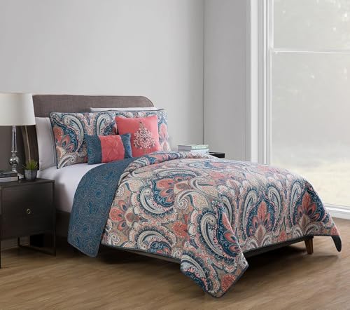 VCNY Home Casa Re'al Reversible Quilt Cover and Pillow Shams Bedding Set, King, Coral 5 Piece