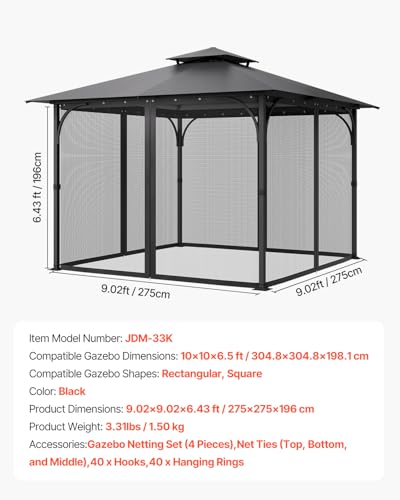 - Fits Most Gazebos: This replacement gazebo netting measures 9.02ft (L) x 9.02ft (W) x 6.43ft (H) / 275 x 275 x 196 cm, and is compatible with most 10ft (L) x 10ft (W) x 6.5ft (H)/ 304.8 x 304.8 x 198.1 cm rectangular or square gazebos, including straight-leg canopies, pop-up tents, pavilions, and wrought-iron tents. The net includes four zippered mesh side panels that cover all four sides of the gazebo.