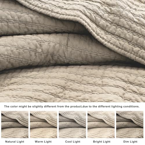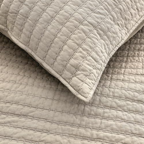 WDCOZY 100% Cotton King Size Quilt Set – Beige Neutral Striped Pick Stitch Soft Lightweight Bedspread, Textured Like Linen, Farmhouse Country Rustic Coverlet, Shabby Chic Gauze Bedding, 3 Pieces
