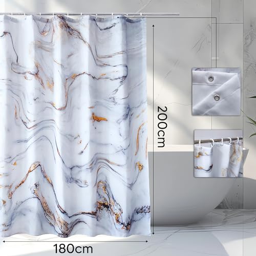 WedDecor Bathroom Shower Curtain Waterproof Anti Mould Mildew Resistant, Heavy Duty 100% Polyester Fabric Curtains Liner with 12 Curtain Hooks, 180cm x 200cm, White & Grey Marble Pattern