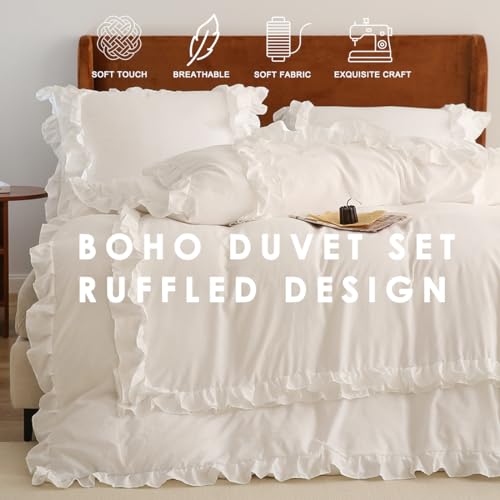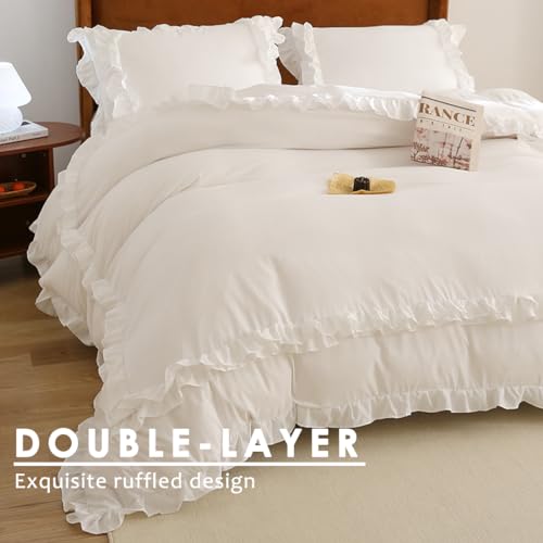 Wotcsil White Ruffle Bedding Set for Women Girls Ruffled King Duvet Cover Set Plain Duvet Cover Shabby Chic Retro Double-Layer Frill Edge Design with Pillowcase
