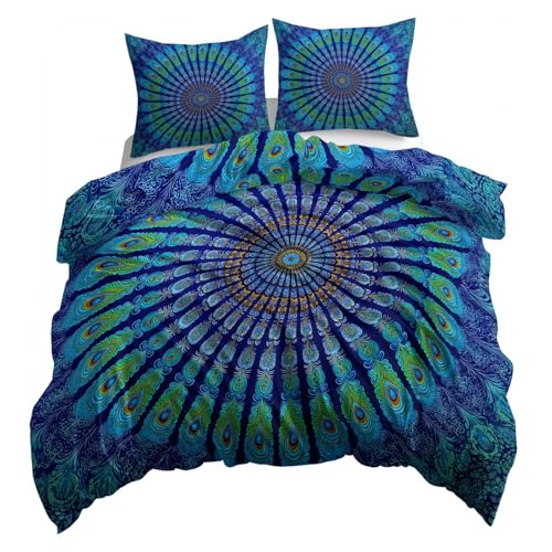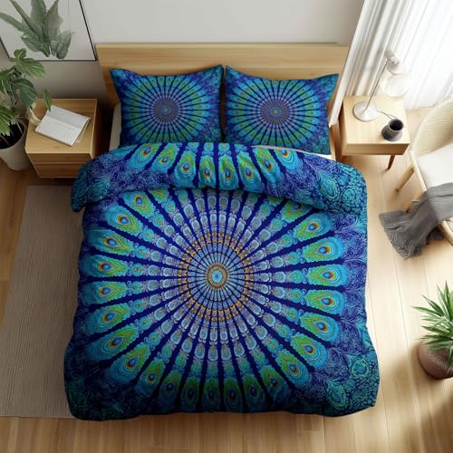 XCQHZYQ Peacock Feather Pattern Bedding Set Emperor Size, Teal Duvet Cover Sets, Luxury Reversible Quilt Cover with 2 Pillowcases, Comfy Breathable Microfibre Summer Bedding