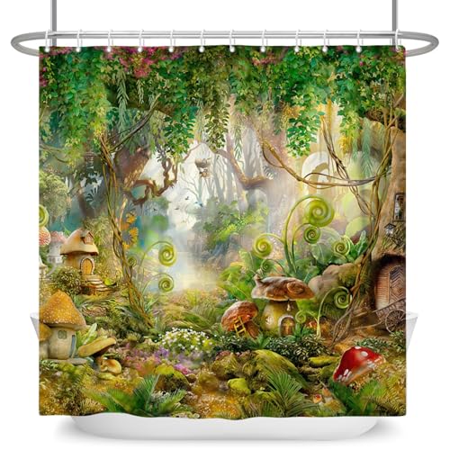 Xiaoterna Fairy Tale Forest Shower Curtain Mushroom Green Tree Grass Bathroom Curtain Spring Magic Enchanted Forest Fantastic Jungle Shower Curtain Machine Washable Waterproof Fabric 120x180cm