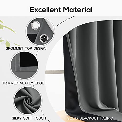 Yakamok 100% Blackout Curtains for Bedroom 84 Inch Length, Grey Full Light Blocking Drapes with Black Backing, Noise Reducing Thermal Insulated Grommet Panels for Living Room, 2 Panels, 52Wx84L,Gray