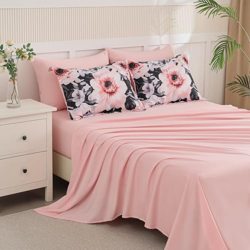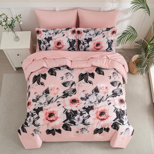Yogeneg Queen Comforter Set 7 Piece Bed in a Bag,Pink Black Floral Botanical Pattern Blush Bedding Set,Soft Microfiber Comforter with Sheet Set,All Season Bed Set(Pink Black,Queen)
