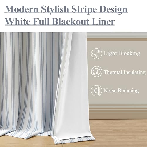 2 panels per package, each measuring 55″ wide and 84″ long. Blue Vertical Stripes on White Cotton Blended Light Filtering Fabric with WHITE Liner. Please reach out to us at any time about any problems with curtains.